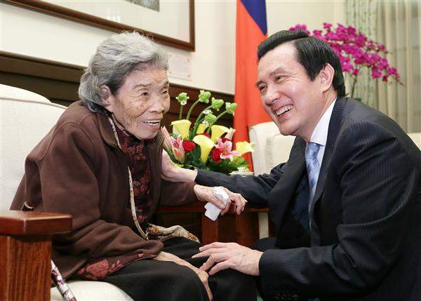 馬英九總統上午接見鄭陳桃及許陳蓮花女士等一行,除再度向阿嬤們的堅強及勇敢表達感佩之意,並肯定婦援會長期以來為慰安婦爭取權益所付出的努力及貢獻。