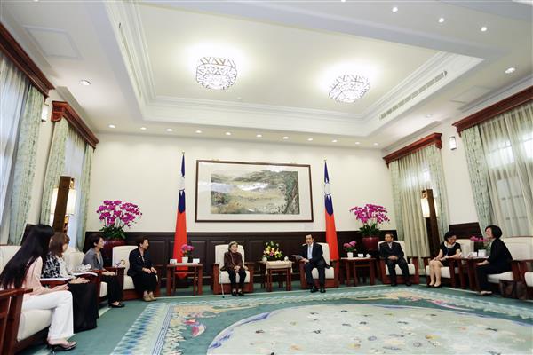 訪賓一行尚包括婦女救援基金會執行長康淑華、董事葉德蘭及高小晴等,由衛福部次長曾中明陪同,前來總統府晉見總統。