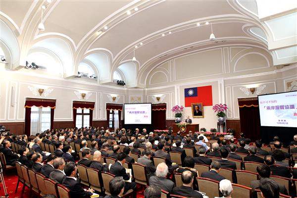 總統府上午舉行總統府月會,馬英九總統親臨主持,並聽取經濟部長張家祝以「你不可不知的服貿協議真相」為題發表專題報告。
