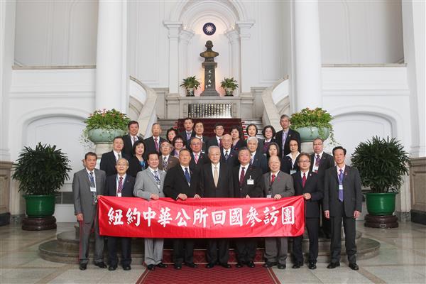吳敦義副總統上午接見「紐約中華公所」回國參訪團,誠摯歡迎訪賓回國參訪,除感謝與會者堅定支持政府,並期勉與政府同心同德,繼續為國家進步與壯大發展而貢獻心力。