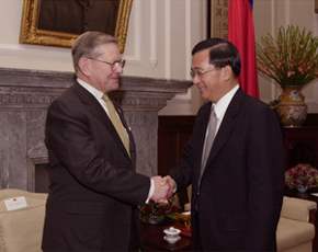 陳總統水扁先生今天上午接見美國大西洋理事會訪華團,代表中華民國政府及人民,對訪團成員的來訪,表達誠摯歡迎之意。