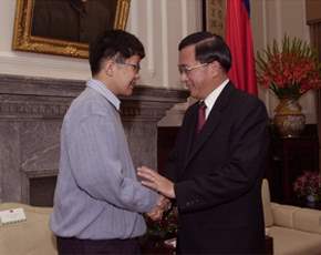陳總統水扁先生今天下午在總統府接見模里西斯華裔少年Chan-Kam Kevin,恭禧他的顱顏整型手術成功,復健順利。