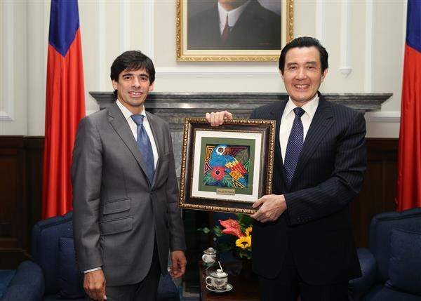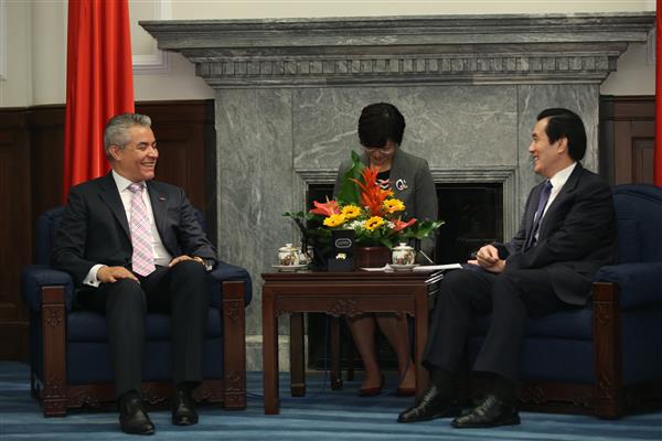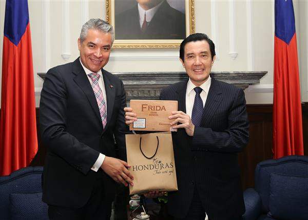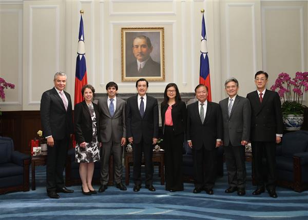 馬英九總統上午接見宏都拉斯駐「世界貿易組織」(WTO)大使卡斯迪歐(Dacio Castillo)與巴拿馬駐WTO大使蘇士昆(Alfredo Suescum)伉儷,誠摯歡迎訪賓遠道來訪,並說明我國對保障智慧財產權及積極參與區域經濟整合之成果。