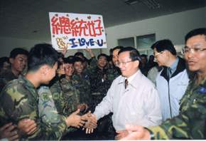 寒冬時節,各位官兵弟兄不向艱難的環境低頭,認真踏實的從事訓練、強化戰力,阿扁印象深刻,再次對大家的努力與辛勞,表示嘉勉之意,期望大家一本以往認真積極的工作態度,和犧牲奉獻的精神,在既有的成效上精益求精,為擔負未來台澎防衛作戰,儲備最精強的戰力。