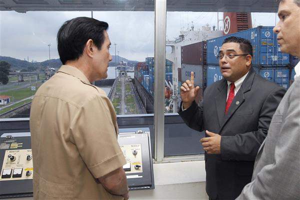 下午,馬總統一行前往巴拿馬運河觀花水閘參訪,總統抵達後,首先由巴國運河管理局局長齊哈諾(Jorge Luis Quijano)陪同進入行控中心,聽取運河操作系統與流程之解說。隨後,馬總統按下水閘開關,並至該中心陽台觀看貨船行經運河之過程,同時也向在對岸觀花水閘大樓景觀台等候的訪團成員及隨行媒體揮手致意。