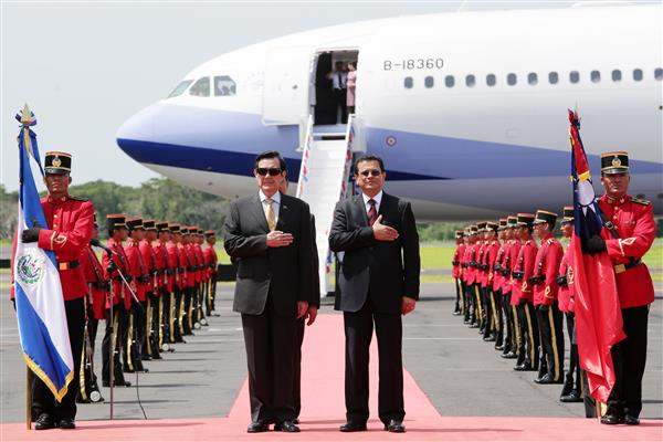 專機停妥後,我駐薩國大使李新穎及薩國外交部禮賓司司長阿雷法洛(Cesar Arevalo)登機迎接馬總統,薩國外交部長馬丁內斯(Hugo Roger Martinez Bonilla)迎於機梯旁,並陪同馬總統步上紅地毯接受禮兵致敬,嗣薩國軍樂隊演奏兩國國歌,薩京市長吉哈諾(Norman Quijano González)隨即致贈市鑰予馬總統,以表達對我訪團的誠摯歡迎之意。