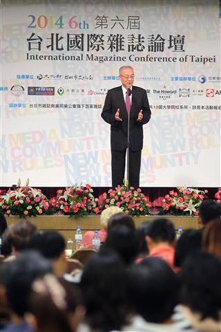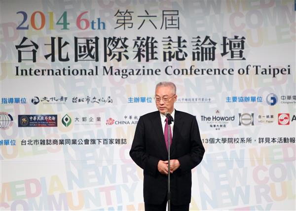 吳敦義副總統上午出席由「臺北市雜誌商業同業公會」所舉辦的「第六屆臺北國際雜誌論壇」開幕典禮,期許臺灣雜誌界持續提供國人最新資訊,並能結合國際觀點,在全球引領風潮。