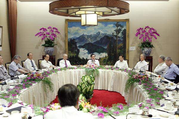 馬英九總統今(10)日下午偕同吳敦義副總統在總統府與五院正、副院長及秘書長茶敘,針對兩岸關係、外交情勢、國內經貿發展、公務人員年金制度及司法改革等議題,廣泛交換意見。