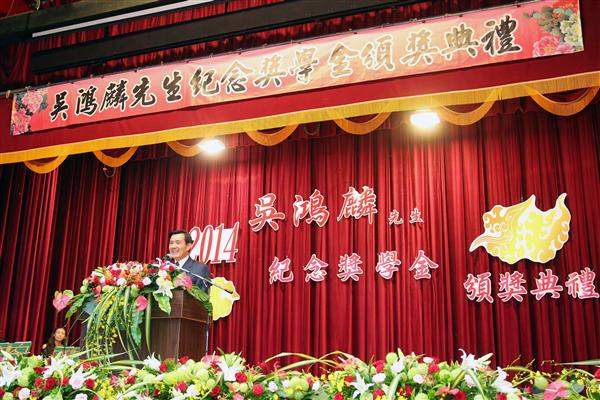 總統於致詞時表示,今天是他就任後第6次前來頒獎,此項獎學金自民國85年成立迄今,已有19年歷史。該獎項係為延續吳鴻麟老先生之愛心與善行,在吳家子弟相繼傳承下,「三代造福鄉梓、百年桃園世家」的精神蔚為美談,如此仁心義舉,令人感佩。