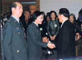最後,阿扁要對在座的各位眷屬們表達最高的敬意,個人深知身為軍眷是很辛苦的,特別是當夫婿或子女服務外島或偏遠地區的時候,因為有你們在幕後無怨無悔的付出,長期忍受聚少離多的日子,默默的犧牲奉獻、以及任勞任怨的支持鼓勵,才能讓各位將領們專心致力在防衛國土的職責上,而享有今日這份得來不易的榮耀,阿扁誠摯的向各位眷屬致上衷心的謝忱,今後國家倚重大家的地方必然更多,希望大家能同心協力,攜手創造充滿希望的廿一世紀!祝福中華民國國運昌隆之外,也要祝福國軍進步精實,各位身體健康、家庭幸福、新年快樂,謝謝大家。