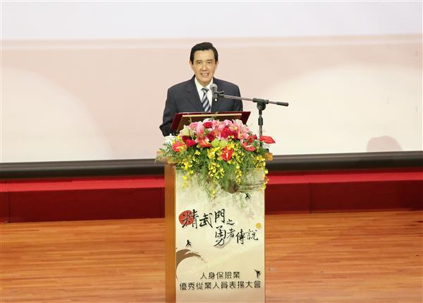 總統致詞時首先對今日接受表揚的499位壽險從業人員表達祝賀之意,並表示,目前全國共有78萬金融從業人員,保險業占55萬人,其中登錄壽險業務員約33萬人,而受獎者不僅在保險本業有傑出表現,更熱心參與公益活動,為社會帶來正面的力量,令人敬佩。此外,主辦單位「中華民國人壽保險商業同業公會」已連續7次獲內政部頒發「全國性優良社會職業團體優等獎」,對於推動壽險業健全發展貢獻卓著。