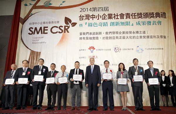 隨後,副總統親自頒發「臺灣中小企業優良企業社會責任獎」予旭聚企業、勁園國際、宗瑋工業、旭光箔膜科技、大愛感恩科技、臺灣今品、康揚股份有限公司、彩宸企業、合勁企業及樹德企業等企業代表。
