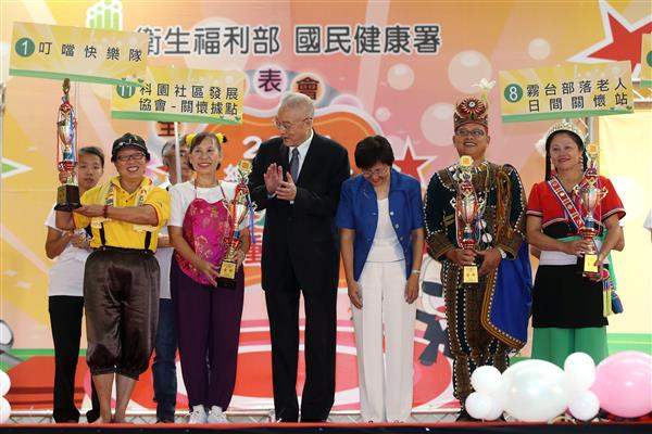 隨後,副總統親自頒發「不老英雄獎」予本次參賽者中高齡90歲以上的10位長者,另頒發各分區競賽金牌獎予得獎隊伍,包括北區優勝「叮噹快樂隊」、中區優勝「科園社區發展協會」、南區優勝「霧台部落老人日間關懷站」及東區優勝「馬可認文化藝術舞蹈協會」。