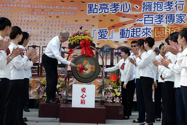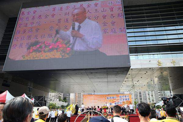 吳敦義副總統今(5)日上午前往臺中市政府府前廣場出席由「中華民國一貫道總會」所舉辦的「點亮孝心、擁抱孝行─百孝傳家『愛』動起來」園遊會開幕式。