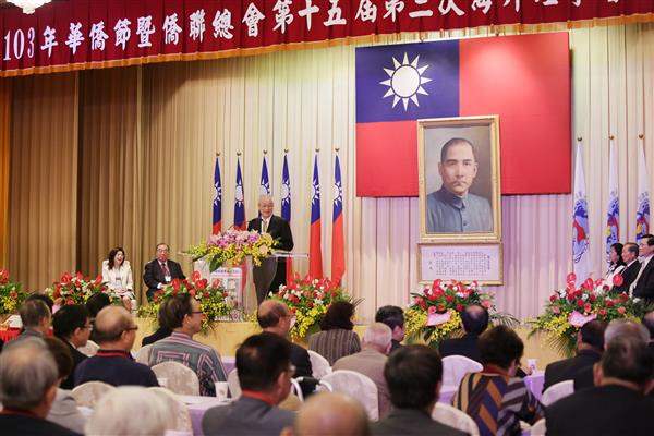 副總統致詞時首先表示,103年前先賢先烈犧牲奉獻,歷經黃花崗之役、鎮南關之役及武昌起義等大小戰役,終於創建中華民國成為亞洲第一個民主共和國,華僑在過程中不僅捐輸財產,更奉獻出寶貴的生命;其後在對日八年抗戰中,華僑再度投入人力物力支援抗戰,協助國家抵抗外侮與復興中華民族;至政府播遷來臺,施行《獎勵投資條例》,海外華僑亦積極返國投資,促進我國經濟成長與社會發展,貢獻卓著。