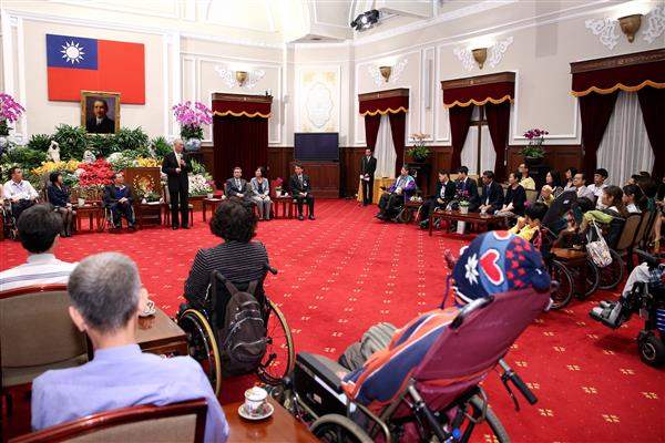 訪賓一行約60人由「社團法人中華身心障礙者職業技藝協會」理事長陳土金陪同,前來總統府拜會副總統,衛生福利部次長曾中明、衛福部社會及家庭署副署長祝健芳及國父紀念館館長王福林等均在座。