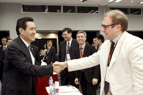 總統告訴與會者,他自6年前上任以來,即積極改善兩岸關係,目前兩岸關係穩定發展,再加上兩岸經貿互動逐步制度化,使許多跨國企業能放心選擇在臺灣增資或新設事業,做為前進大陸及亞洲市場的區域營運總部。
