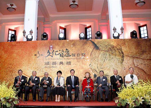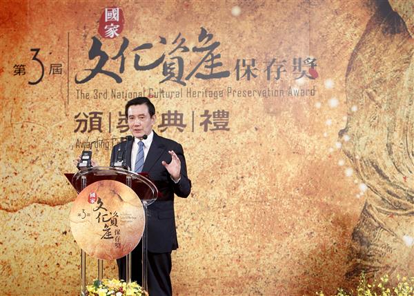 馬英九總統今(8)日下午前往臺北市中山堂出席「第三屆國家文化資產保存獎」頒獎典禮,除肯定得獎者保存及傳承文化資產的貢獻,並說明政府推動文化資產保存的作為。
