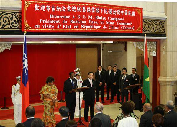 馬英九總統偕同吳敦義副總統今(9)日上午以隆重軍禮歡迎布吉納法索總統龔保雷(Blaise Compaore)伉儷訪華,並盼未來兩國合作關係持續深化、邦誼永固。
