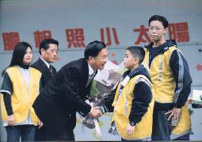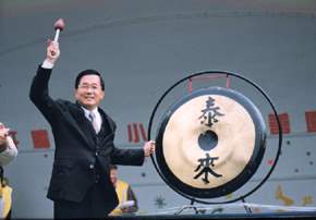 我知道,這很辛苦,的確很辛苦,所以阿扁特地要來到這裡和大家站在一起,感謝各位的努力,也為各位加油打氣。等一下,阿扁要為大家敲響愛心鑼,這就是阿扁總統和全國的朋友為大家所作的一個紮紮實實、活力充沛的「人工呼吸」,讓大家更有衝勁、更有希望!