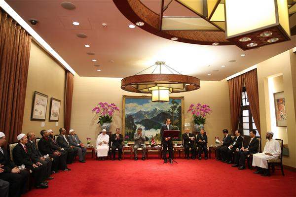 總統說,全球共有57個回教國家,穆斯林人口超過15億人,其中臺灣信奉伊斯蘭教的穆斯林人數約5萬人,另有約15萬名在臺工作的印尼回教徒,人數雖然不多,但卻為臺灣注入多元且豐富的宗教文化。