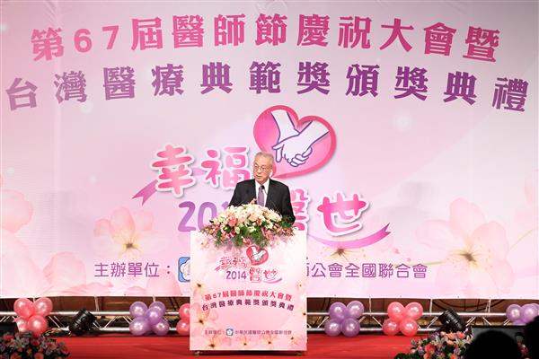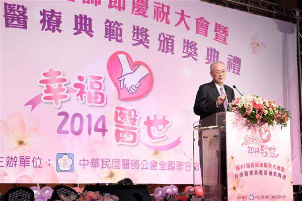 吳敦義副總統今(12)日下午出席由「中華民國醫師公會全國聯合會」所主辦的「第67屆醫師節慶祝大會」暨「臺灣醫療典範獎」頒獎典禮,除表彰獲獎醫師長期維護民眾健康之付出與貢獻,並重申政府將致力改善醫護人員工時過長及人力短缺之情形。