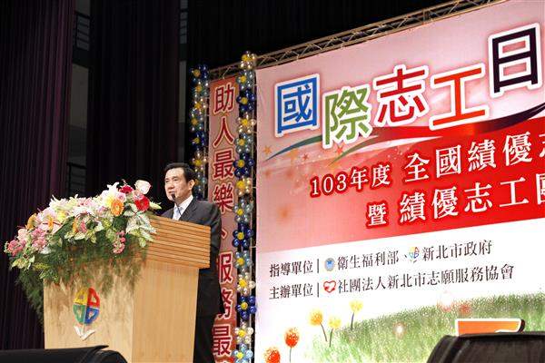 馬英九總統今(5)日下午前往新北市政府出席「103年全國績優志工暨績優志工團隊」頒獎典禮,對獲獎績優志工暨團隊長期服務國家社會之卓越貢獻,表達肯定與感佩之意。