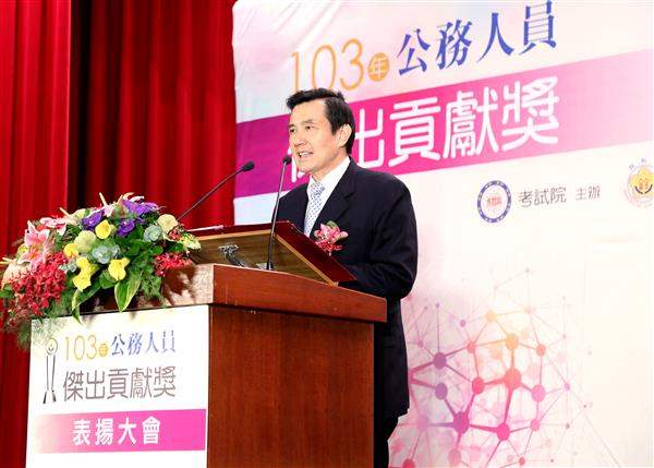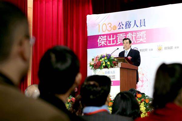 馬英九總統今(17)日下午前往考試院出席「103年公務人員傑出貢獻獎表揚大會」,除肯定獲獎者造福百姓,對國家貢獻卓著,並期勉渠等持續發揮正面影響力,讓我公務人員服務品質及工作績效更加提升。