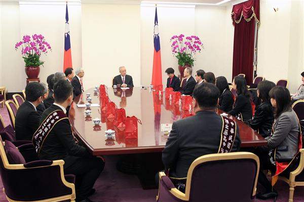 訪賓一行約20人由「中華民國藥品行銷暨管理協會」理事長梁明聖及立法委員洪昭順陪同,前來總統府拜會副總統,衛生福利部次長許銘能亦在座。