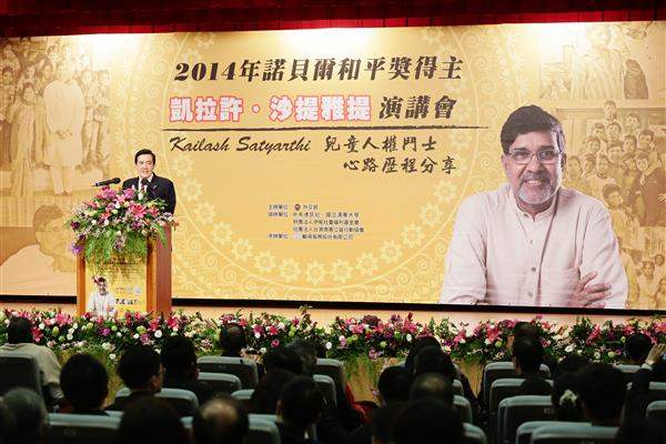馬英九總統今(15)日下午出席2014年諾貝爾和平獎得主凱拉許‧沙提雅提(Kailash Satyarthi) 演講會,對渠長年為兒童權益奮鬥,表達敬佩與肯定之意。