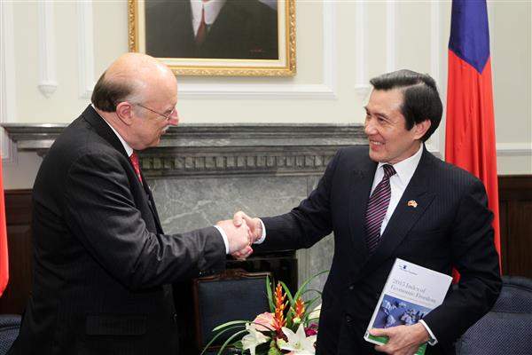 馬英九總統今(9)日上午接見美國「傳統基金會」貿易暨經濟中心主任米勒(Terry Miller)大使,除說明近年來我國全球經濟自由度表現及臺美經貿合作之具體成果,亦強調我國將持續洽簽《自由貿易協定》(FTA)或《經濟合作協議》(ECA),以加速經貿自由化的腳步。