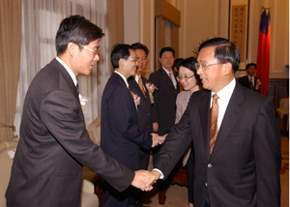 陳總統水扁先生今天接見國內第廿四屆及海外華人第十屆創業青年楷模當選人,對他們獲選,代表政府表達祝賀與肯定之意。
