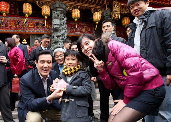 今(19)日是農曆大年初一,馬英九總統上午前往臺北松山慈祐宮及關渡宮祈福參拜,並發送羊年新春福袋向民眾拜年,期盼大家共同努力,讓臺灣經濟越來越好。