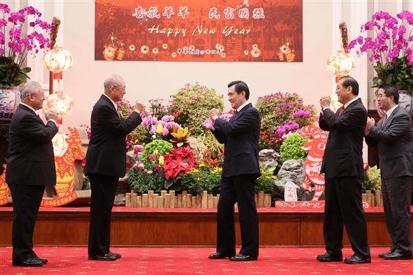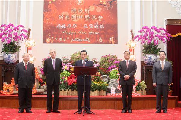 馬英九總統今(24)日上午偕同吳敦義副總統出席總統府104年新春團拜暨茶會,與總統府全體同仁互道新春愉快、萬事如意,並祝福我國在新的一年「喜氣羊羊、民富國強」。