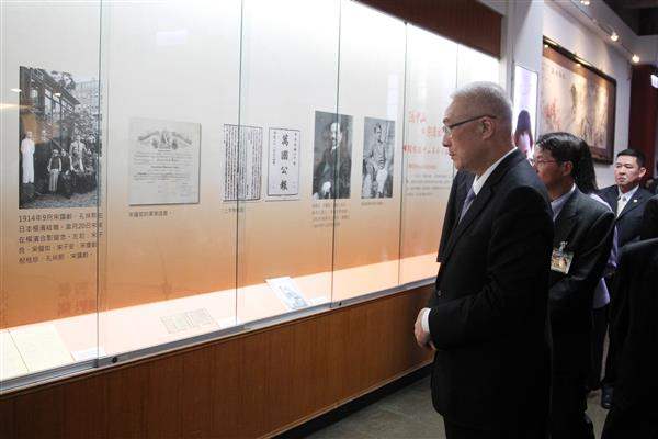 隨後,副總統在國父紀念館館長王福林、文化部次長陳永豐及「中山學術文化基金會」董事長許水德等人陪同下參觀展場文物及史料。