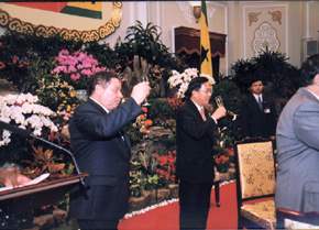 最後本人謹邀請各位共同舉杯,敬祝梅尼士總統閣下政躬康泰!聖多美普林西比民主共和國國運昌隆!中、聖兩國友誼長存!謝謝各位。