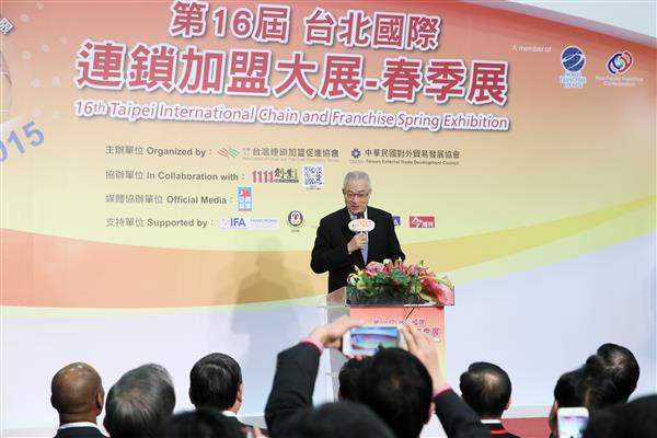吳敦義副總統今(12)日上午前往臺北世貿一館出席「臺北國際連鎖加盟大展春季展」開幕典禮,除肯定本土自創品牌業者在經營上的努力,亦鼓勵業者進一步推展自家品牌至世界舞台、進軍全球市場。