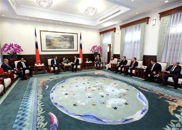 訪賓一行由中華民國銀行公會理事長李紀珠及金管會副主委黃天牧陪同,前來總統府晉見總統。國家安全會議諮詢委員楊念祖也在座。