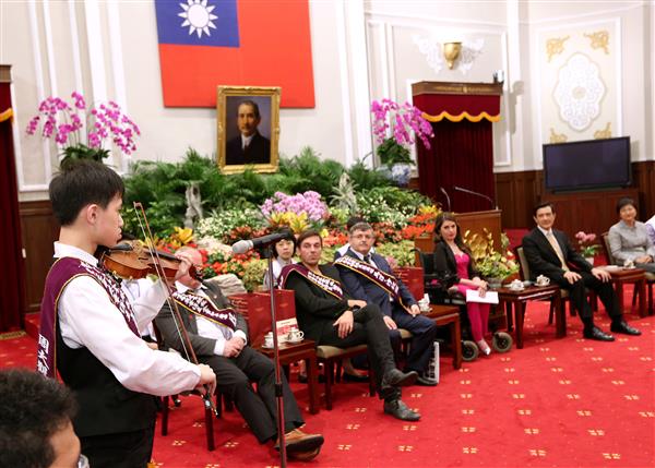 隨後,總統觀賞得獎人陳冠文同學演奏小提琴,並於得獎人葉家銘同學以烏克麗麗演奏「月亮代表我的心」曲目時,與所有人共同合唱,現場氣氛溫馨感人。