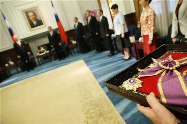 贈勳儀式在禮官宣讀勳章證書後,由總統親為馬啟思處長佩掛勳章;授勳後,總統向受勳人握手致賀並合影。