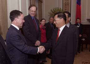 總統表示,訪賓們對台灣都是非常了解、友好與支持的,但也無法正確預知選舉結果,更何況大陸對我充滿敵意,對他的了解有限,所以會有誤判是可以理解的。總統重申,他努力改善兩岸關係的誠意沒有改變,想要使兩岸關係正常化的心意也沒有改變,更沒有放棄期待兩岸領導人握手的一刻;他並呼籲大陸當局,選前看不起他,看不起新政府,但選後希望能接受台灣人民的選擇,能把握這稍縱即逝的機會之窗,更希望台灣的民主成果對大陸的現代化、民主化能產生燈塔效應。