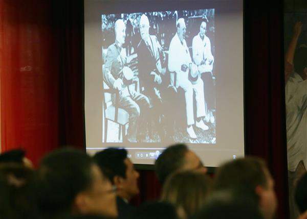總統抵達後,先觀賞一段蔣宋美齡女士72年前於美國國會上的演說,隨後致詞時表示,為慶祝我抗戰勝利70週年,政府自今(104)年3月至10月舉辦一系列活動,上(6)月16日,他出席「104年三軍五校聯合畢業典禮」,並在典禮中親自頒發「抗戰勝利紀念章」予25位抗戰老兵,其中更包括高齡98歲的老兵劉支球,感謝渠等抗戰中的犧牲與貢獻;此外,紀念章不僅限本人,其遺族均可提出申請,盼能藉此表達中華民國感念先人在抗戰時期的卓越奉獻,更傳達對於渠等英勇事蹟「不但國家沒有忘記,全世界都沒有忘記」。