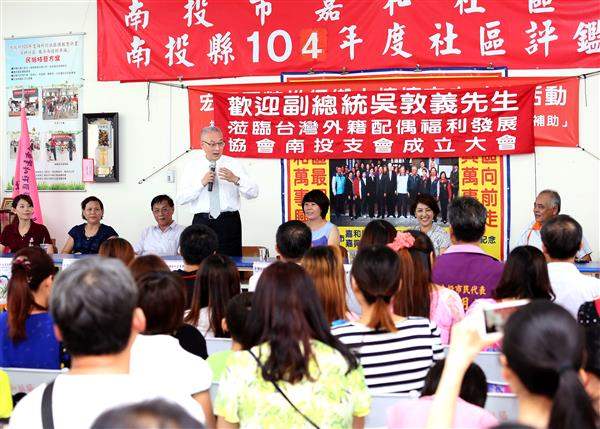 吳敦義副總統今(26)日下午前往南投市嘉和社區活動中心出席「臺灣外籍配偶福利發展協會」南投市支會成立大會。