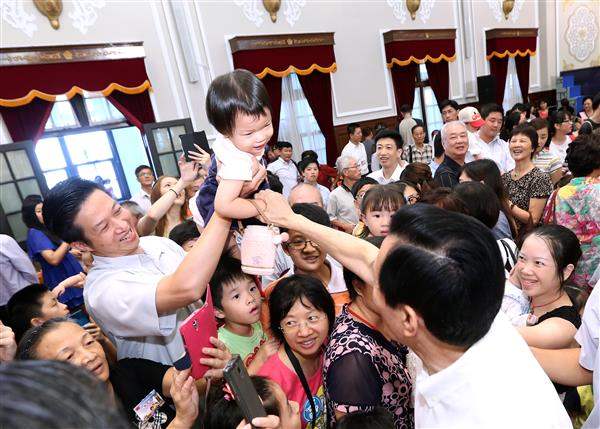 總統於10時45分抵達現場後,受到同仁及眷屬熱烈歡迎,總統也親切地抱起小朋友,與大家溫馨互動及閒話家常。