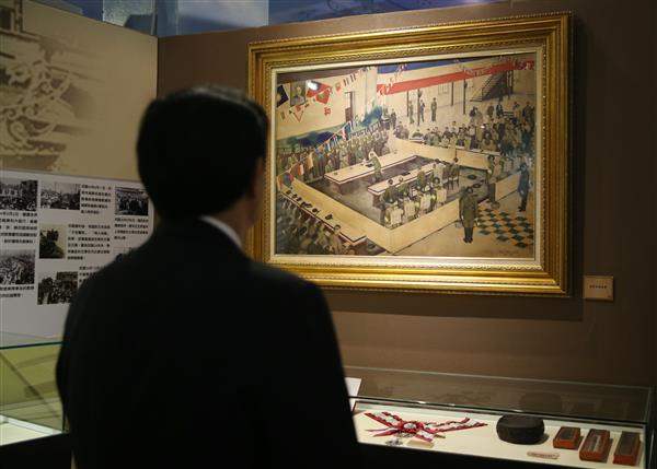 隨後,總統在總統府秘書長曾永權、國安會秘書長高華柱及國防部部長高廣圻等人陪同下,參觀「八年艱苦抗戰」暨「抗戰勝利臺灣光復」展區。