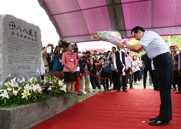 總統抵達屏東縣霧台鄉「霧台谷川大橋」後,首先前往「八八風災救難英雄紀念碑」前獻花致意,隨後於致詞時表示,該紀念碑的設立係為紀念內政部空勤總隊王宗立、張順發及黃鎂智等因公殉職的三位機組員,也令他想起莫拉克風災導致臺東縣太麻里溪潰堤時,空勤總隊弟兄在惡劣天候下,冒生命危險前往搶救受困於「臺灣牛」餐廳屋頂上24位民眾之英勇事蹟。他特別於上(8)月在總統府表揚莫拉克風災救災及重建有功人員,其中包括上述王宗立等3位,共計有9位的公務員或里長、義消及防災專員不幸在莫拉克風災時殉職,渠等的義行令人感佩。