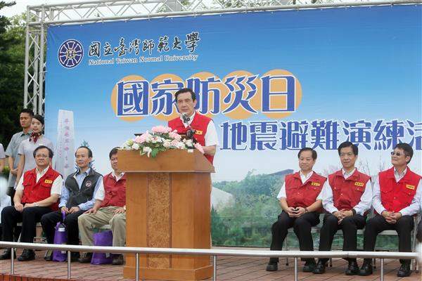 馬英九總統今(21)日上午前往國立臺灣師範大學林口校區視察「104年國家防災日」系列演習-全國學生地震避難演練,除肯定同學們在防災演練時不慌不忙的沈著表現,並說明政府在防災工作方面之作為及努力。