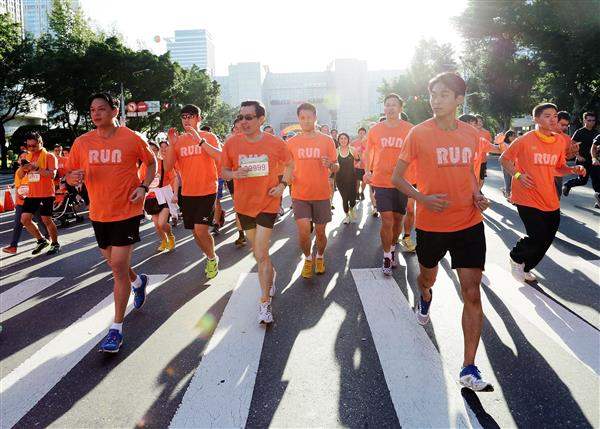 馬英九總統今(4)日上午參加在臺北市政府市民廣場前舉辦的「長庚紀念醫院2015永慶盃路跑活動」,期勉所有參賽者養成規律運動習慣,努力「跑出健康」。
