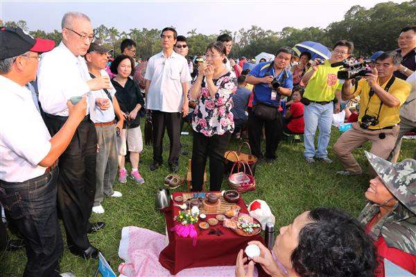 副總統抵達後首先至虎山藝術館品茗,他說「十分鐘內就喝遍世界名茶」,並參觀博覽會各陳設攤位,與民眾親切互動,也至中興高中青年活動中心參與「曲水流觴,舞動茶博」活動。