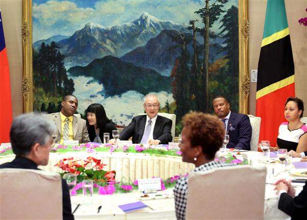 訪賓一行尚包括聖克里斯多福及尼維斯外交及航空部長布蘭特利(Mark Brantley)伉儷,由外交部次長柯森耀及克國駐華大使哈菁絲(Jasmine Huggins)陪同,前來總統府接受副總統午宴款待,國家安全會議秘書長高華柱也在座。